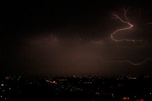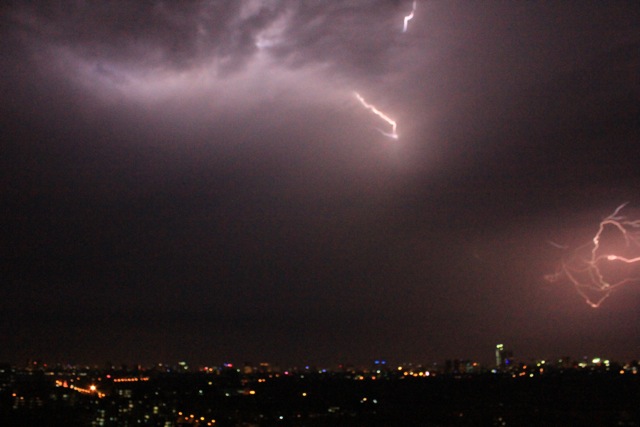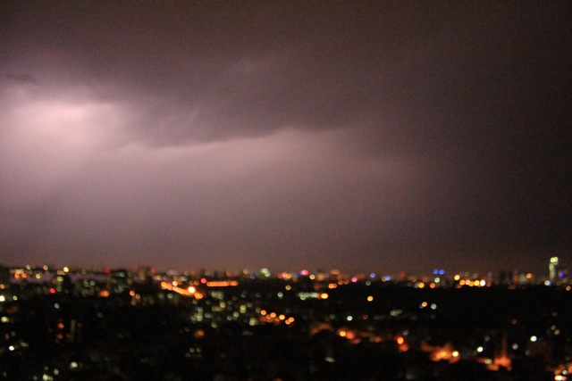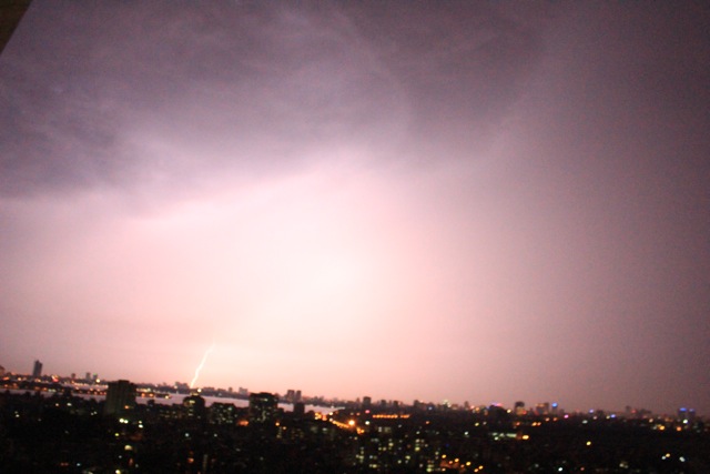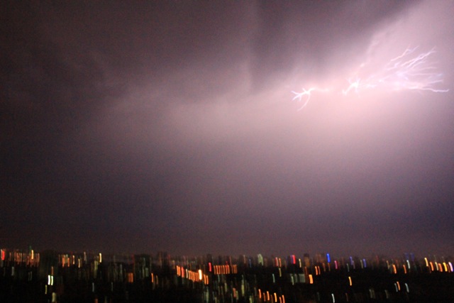 Last night was magical: After days of torturous heat, the clouds had gathered with great pomp and show, and there was a spectacle in the sky. First the sun set in a haze of orange sky, then the dark clouds took over and put on a nature fireworks display with thunder and lightning. It rained elsewhere in the city, but from my window, it looked like God was taking pictures.