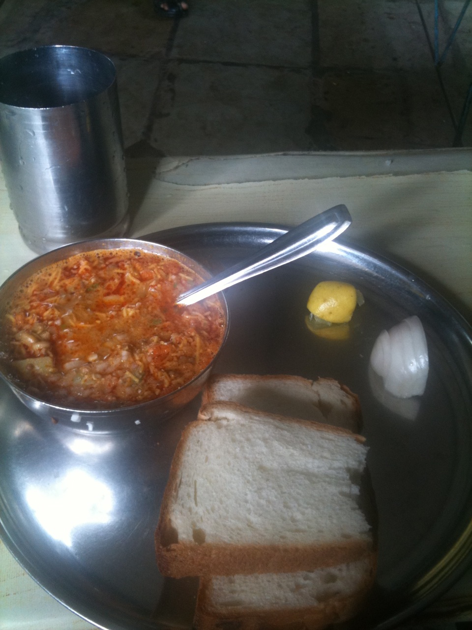 What’s a visit to Kolhapur without one to eat the famous Phadtare Misal? Set in a shed in the busy industrial section of Udyamnagar, Phadtare’s misal hosts not only daily hungry workmen, but also some well-heeled society, and of course, Kolhapuri women visiting their parents’ homes – all sharing benchspace in the modest eatery. As Souvik called it, the ambience is a cross between a factory and garage, but the single dish (with regular & Jain options) costing Rs 20 is really worth much much more!