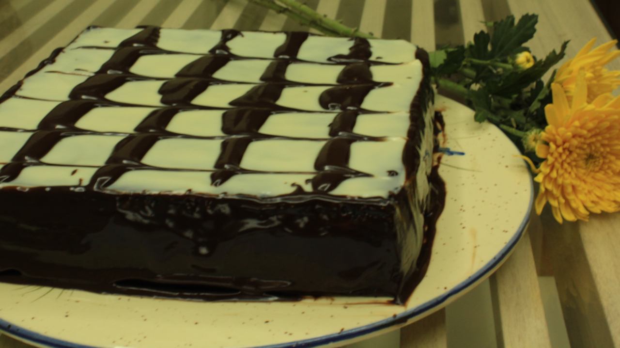 Now for the best part. The cake was ready by 7.30 am, and came off easily, and went straight into the freezer to cool. (This makes it easy to frost.) I had dark and white chocolate chips, which I took out into two separate bowls. Heated some light cream in a saucepan and poured it over the chips (more into the dark than the white). The chocolate started to melt, but not enough, so I heated both in the microwave for 30 sec each. Stirred them separately, and I had two beautiful glazes ready.