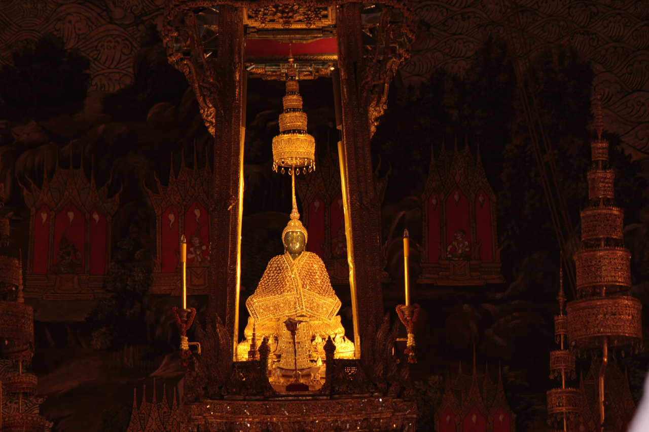 Wat Phra Kaew: Emerald Buddha (actually carved in Jade). This Wat was so ornate all over the interior and exterior, you could be forgiven for missing the Buddha inside. Here the idol is in winter clothes.