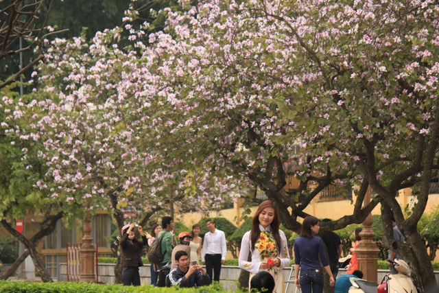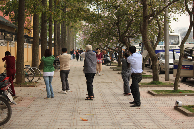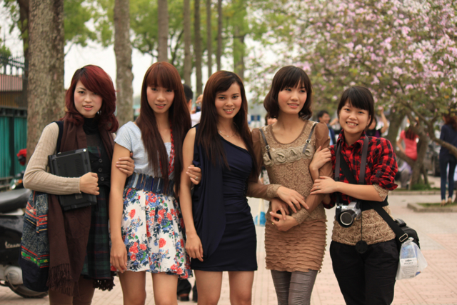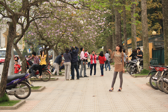 On our way back home, we came across the lane full of cherry blossom trees. What a sight! The lane was filled with people, mostly young ones hanging out, and naturally, girlfriend-posing-boyfriend-photographing. These sights are so common in Hanoi, but every time we spot them, we feel light-hearted and happy.