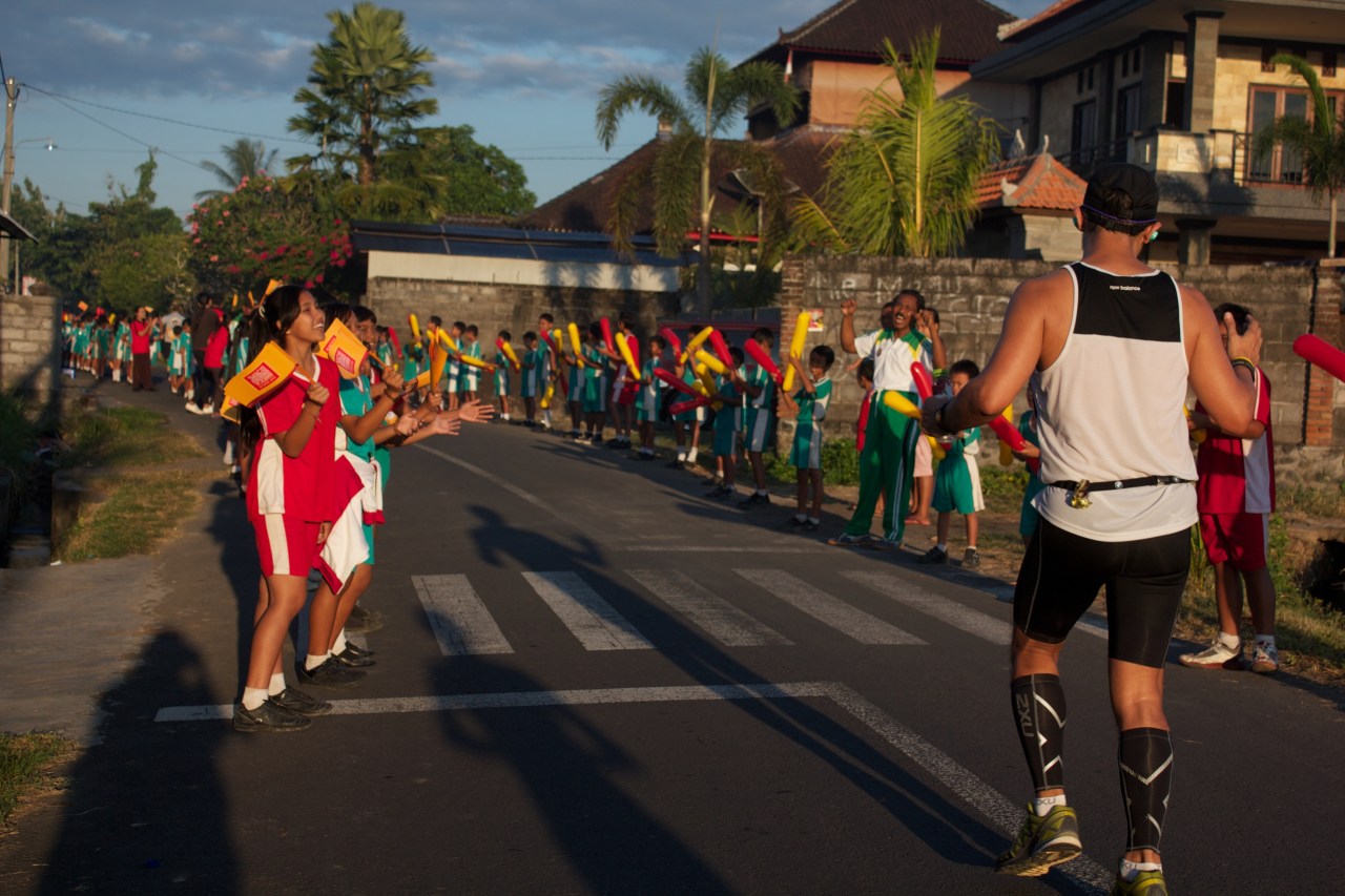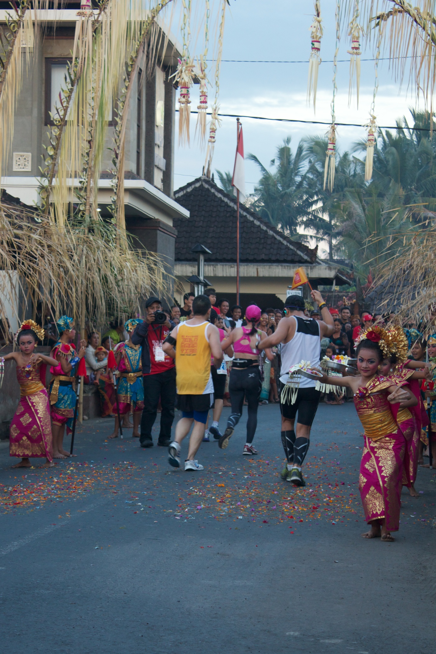 The villagers came out in full force to cheer the runners, complete with costumes, balloons, dances, bright and early, and some of the participants were just as eager to join in the festivities.