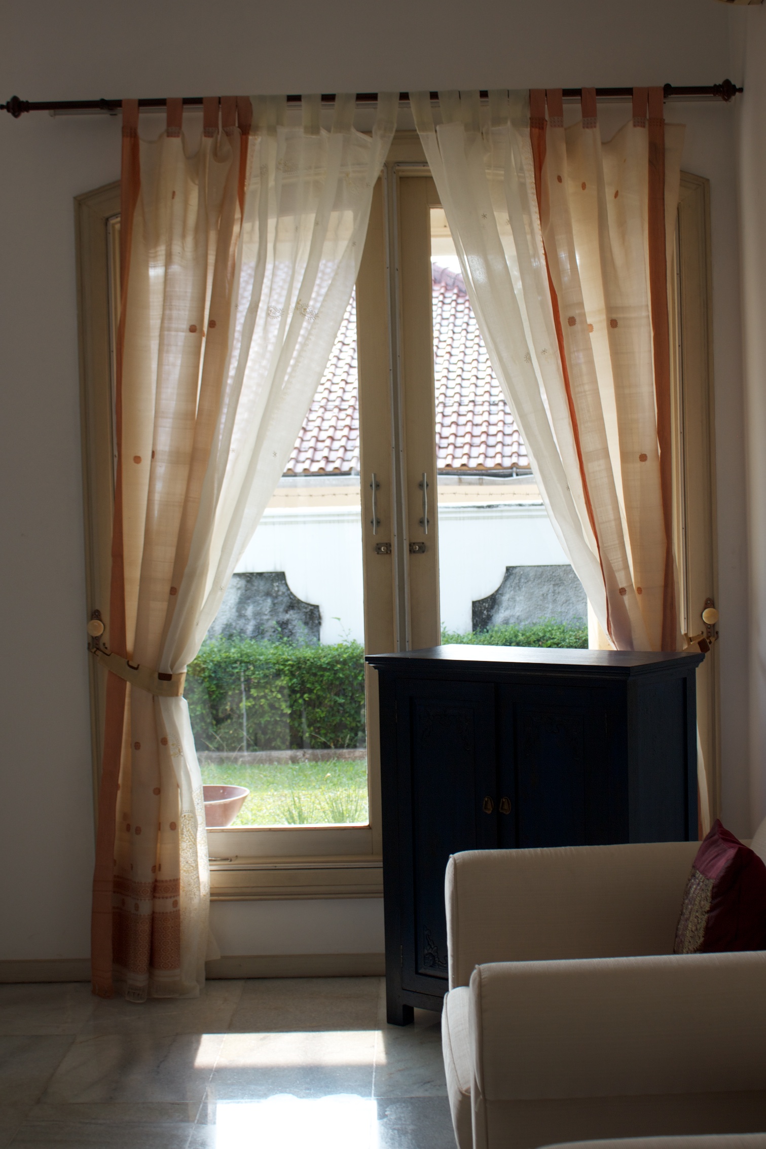 After the blue-door-painting project, the corner window needed some nice curtains, not those synthetic shower-curtain lookalikes that came with the house. So on my last trip to Delhi I begged Ma to part with some of her vintage sarees for this noble cause ;-), and came away with an armful. Still, they rested at the bottom of the cupboard while I took my time, half-heartedly looking for a tailor who could make curtains, then almost bought a sewing machine to DIM (do it myself), almost because I decided on a cheap handheld machine which is apparently not available anywhere. Finally, the makeover itch got the better of me – why not use those God-given tools, and some long-forgotten skills of hemming and hawing? The saree length was just right, and the ‘fall’ made great loops.