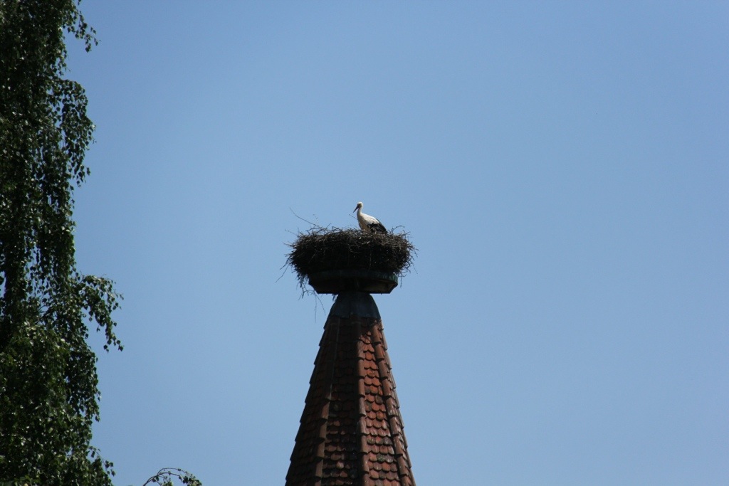 It was a welcome change to see lots of people milling about, shops open (gasp!), informal eating on the sidewalks. This region is famous for storks (les cignones), and we spotted a few in their nest.