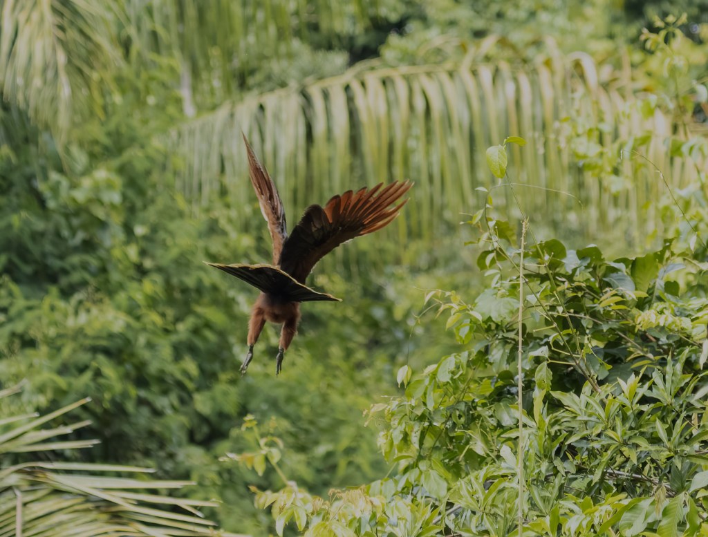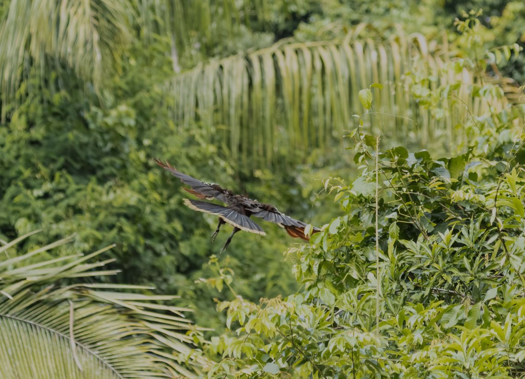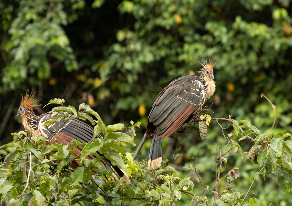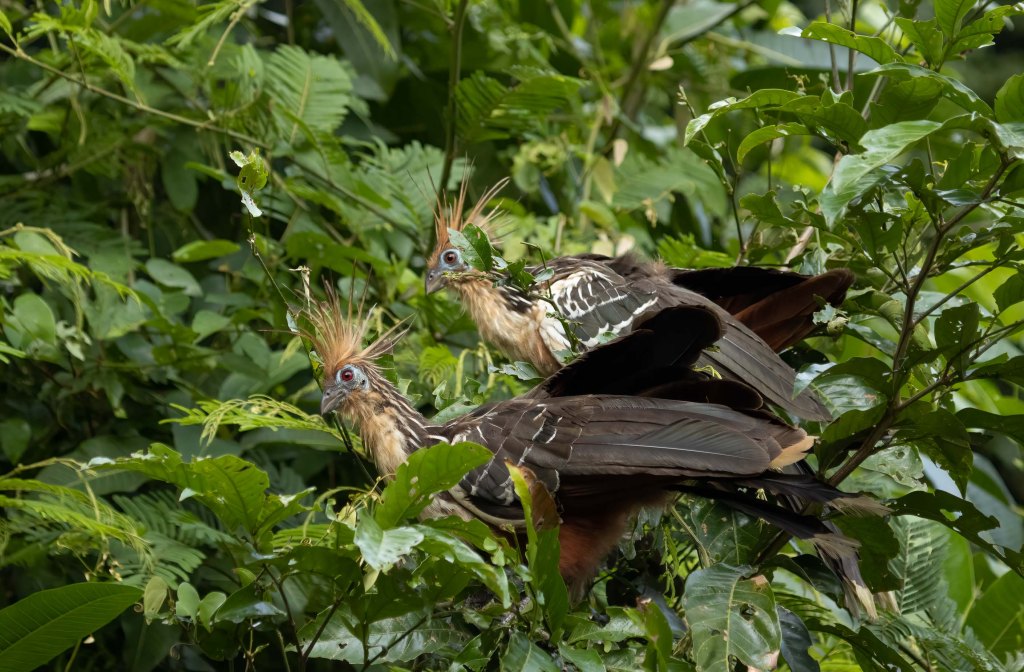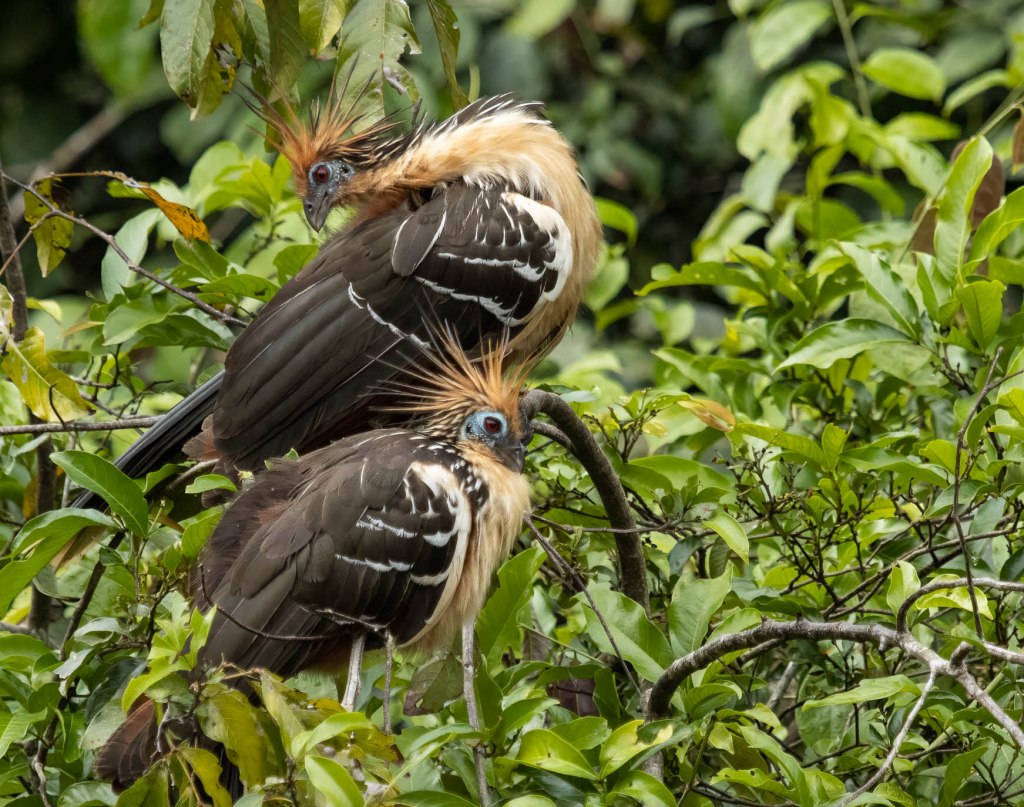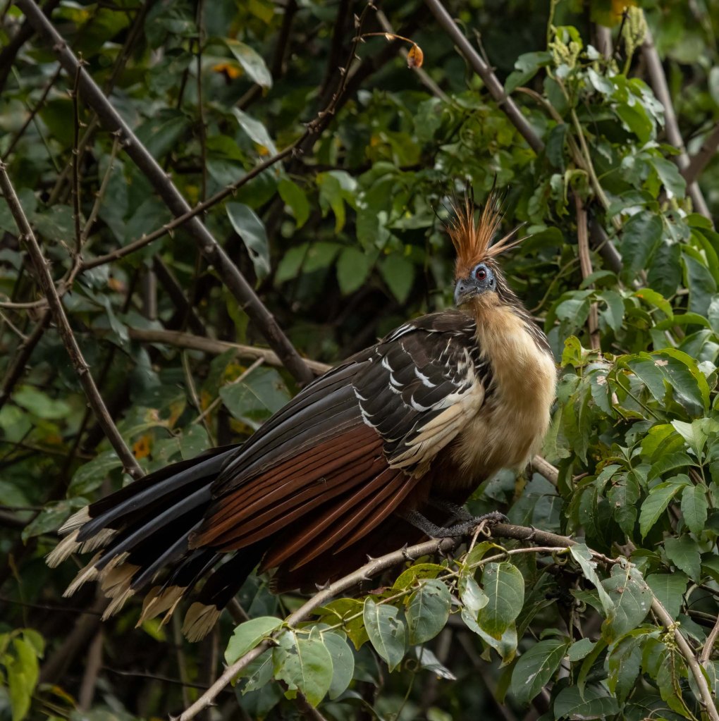 Watching them for about an hour on a gentle boat ride, I got thinking about their evolution history. Later, it was thrilling to learn that scientists have debated over their taxonomy for years, concluding that the Hoatzin branched off from other bird species soon after the extinction of dinosaurs. They sport a look that seems to say they just woke up from a 64-million year sleep, thinking, “what did I miss?”. And yet, they are not endangered, due to having no natural predators, even humans being put off by their stinky aura.