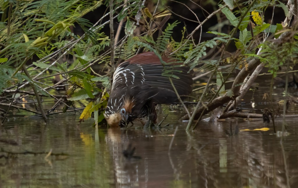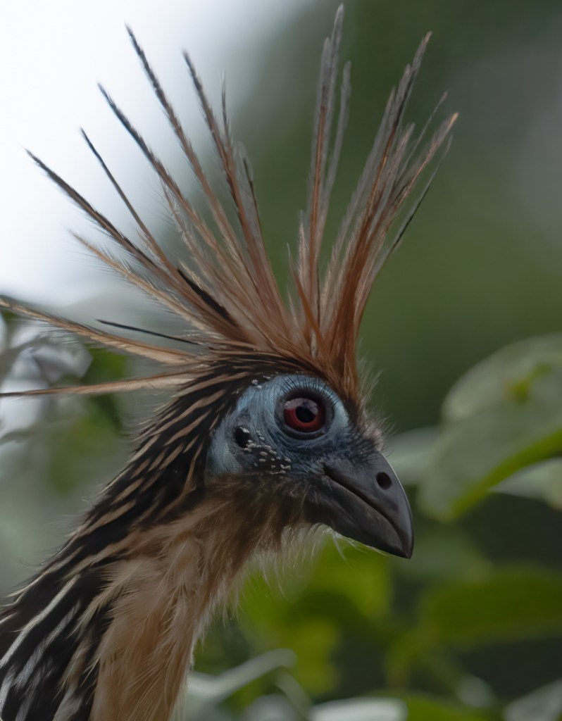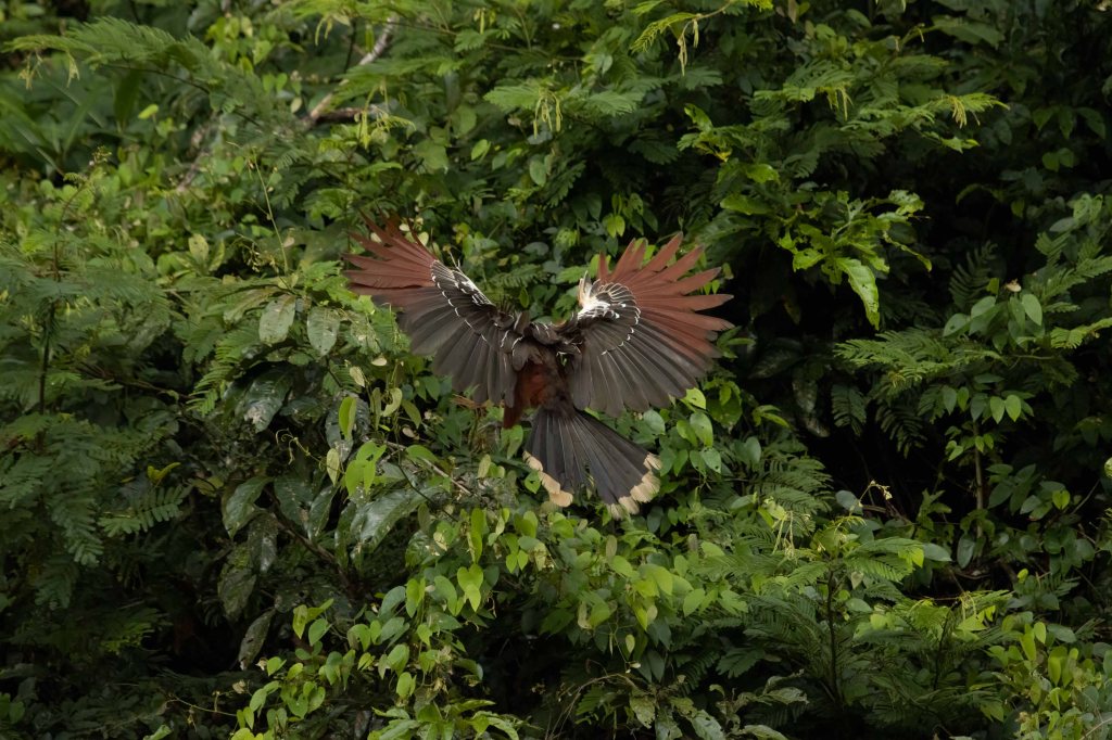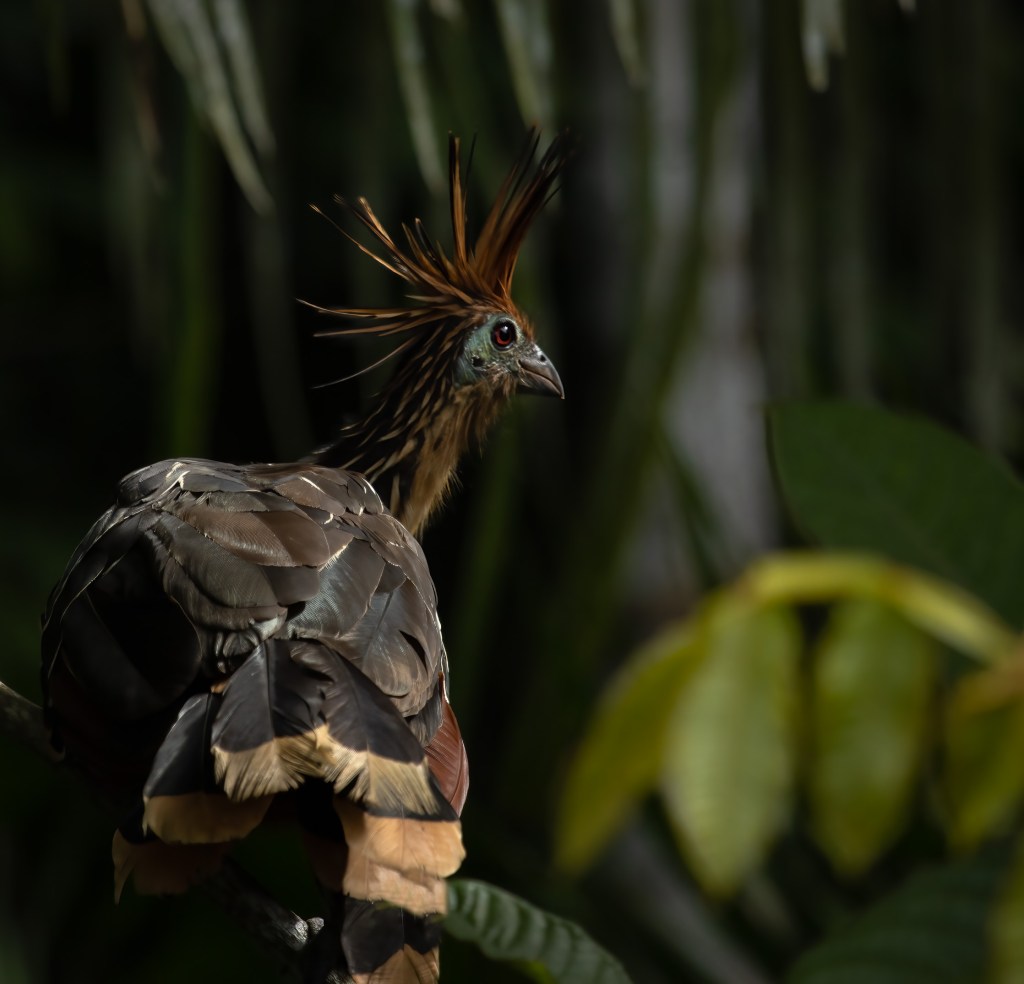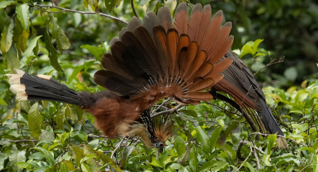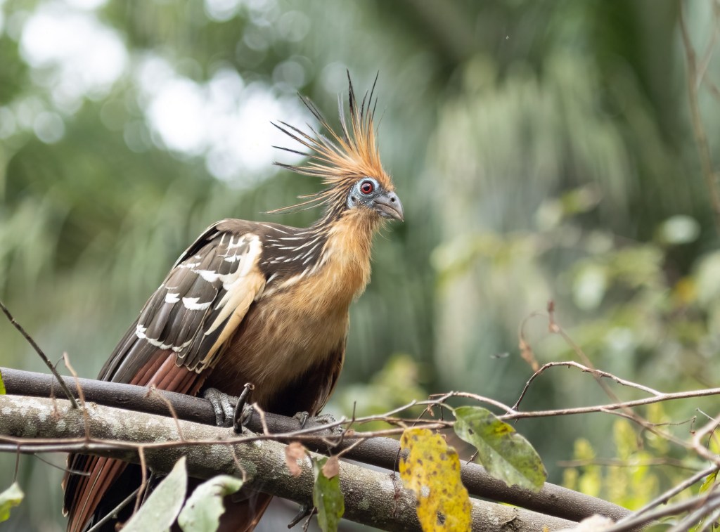 Watching them for about an hour on a gentle boat ride, I got thinking about their evolution history. Later, it was thrilling to learn that scientists have debated over their taxonomy for years, concluding that the Hoatzin branched off from other bird species soon after the extinction of dinosaurs. They sport a look that seems to say they just woke up from a 64-million year sleep, thinking, “what did I miss?”. And yet, they are not endangered, due to having no natural predators, even humans being put off by their stinky aura.